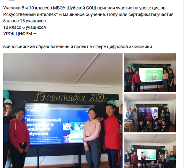 В период с 26 сентября по 23 октября организовано участие в акции «Урок цифры» «Искусственный интеллект в Стартапах» и с 21 ноября по 18 декабря урок цифры «Видеотехнологии».