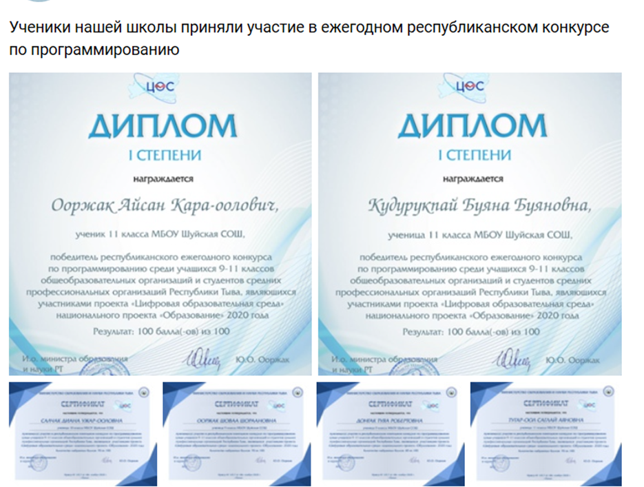 Участвовали во Всероссийской олимпиаде «Безопасный интернет» на сайте Учи.ру. Также приняли участие в олимпиаде Тувинского Государственного университета.